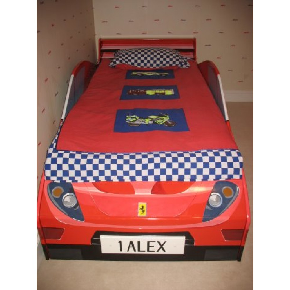 Every little boys dream racing car bed! This one was specially designed for young Alex! Red with hand painted logos and wheels, and also included is a pull-out sleepover bed (you can just see the knobs on the side!). A personal number plate adds the final, magical touch. Matching bedsides, wardrobes,toyboxes, bookcases etc.