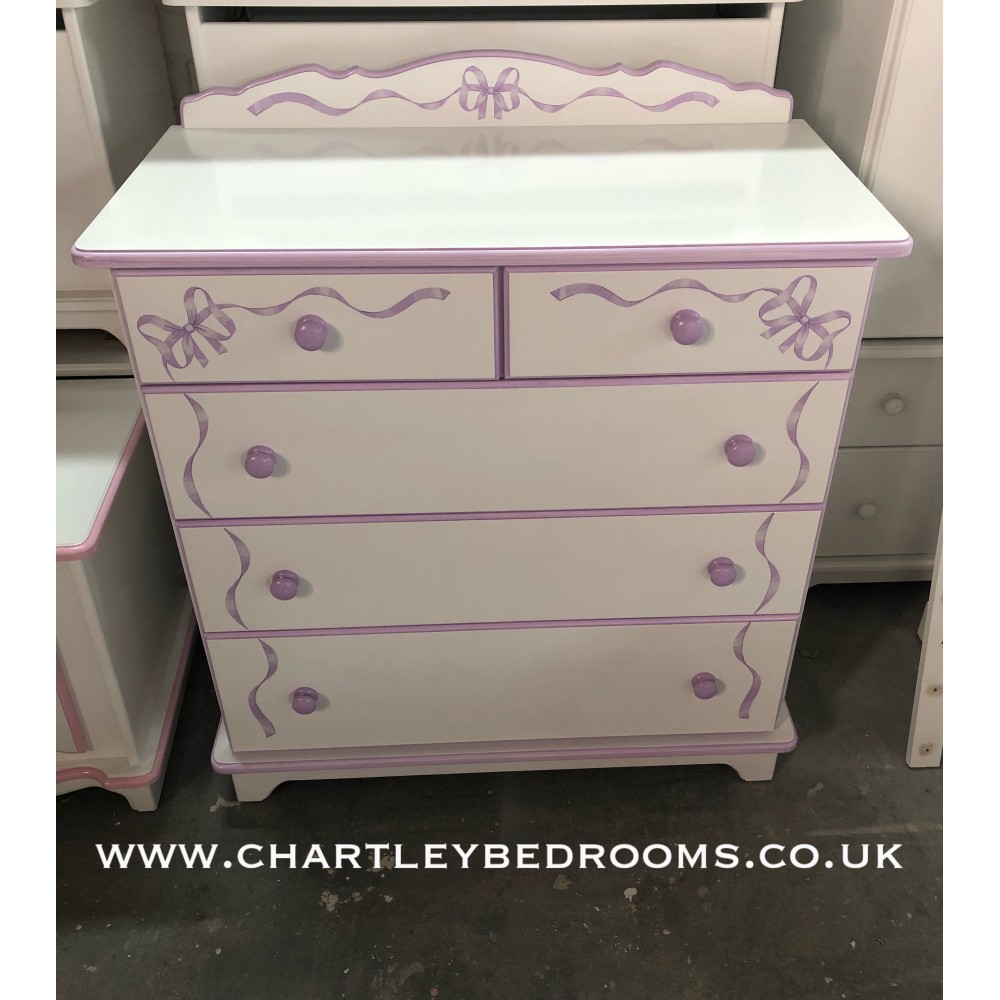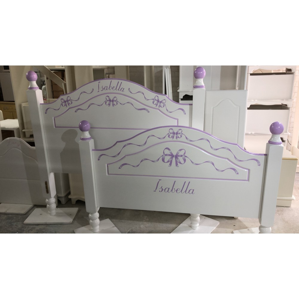 King size double bed in white with hand painted ribbons and bows in lilac. Artwork can be in your choice of colour. Price excludes mattress. Available in any size.