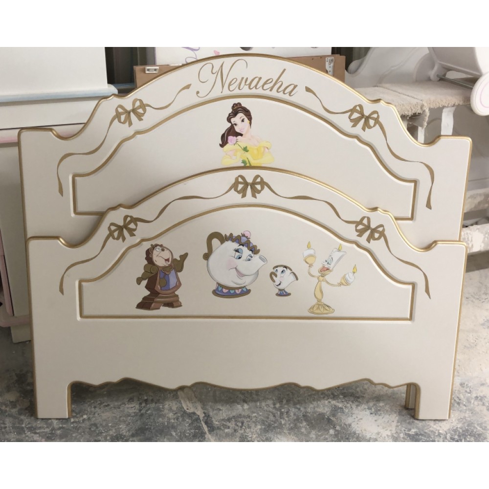 Wonderful small double 4ft size bed with gold edges and stunning hand painted Mrs Potts and friends design artwork. Price includes a single name.