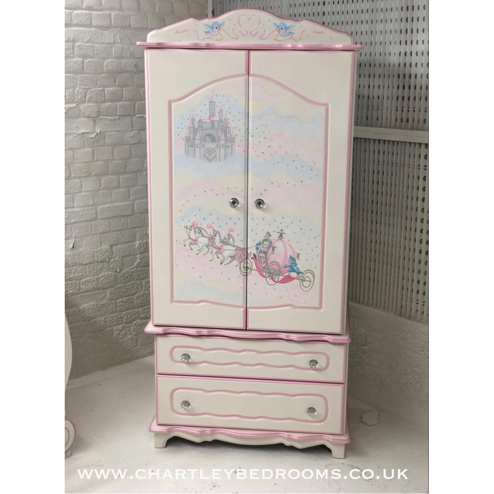 Beautiful Cinderella pumpkin coach wardrobe with 2 drawers and double hanging rails inside. Shown in off white and pink pearl with amazing hand painted artwork. Can be in any chosen artwork colour, with silver or gold accents. Lots of twinkle included! 36" wide x 76" tall x 21" deep - or can be made any size smaller! 91cms wide x 54cms deep x 193cms tall.