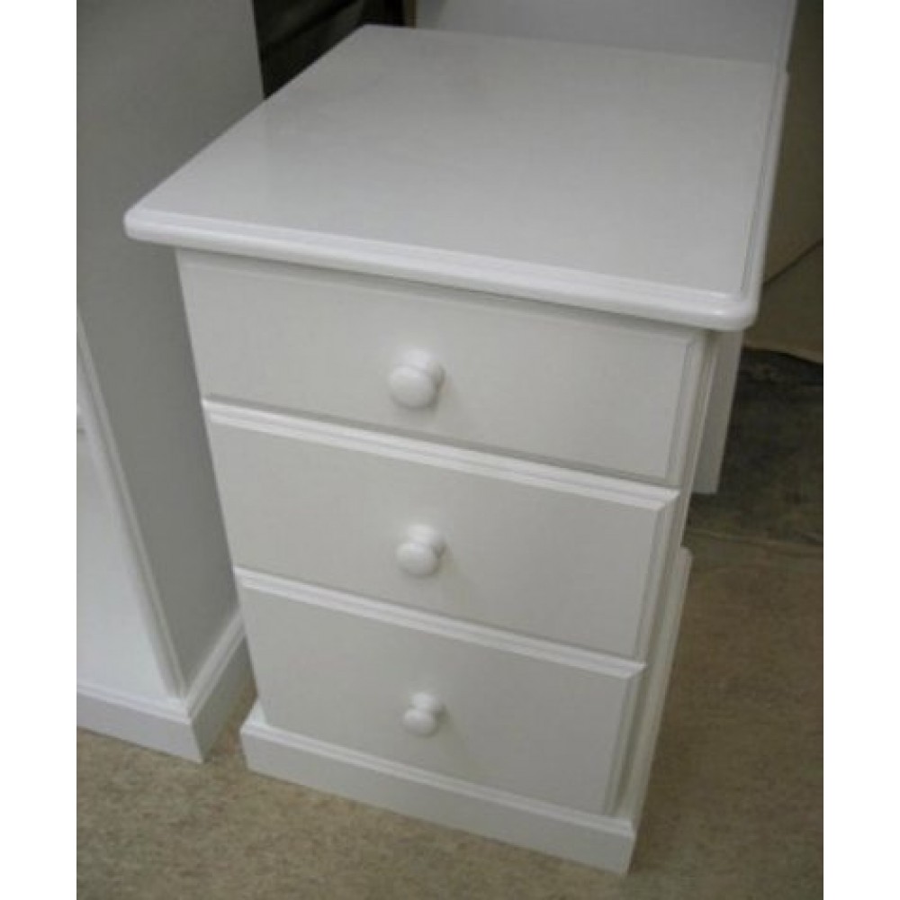 3-drawer bedside chest/unit. Available in 12", 14", 16" or 18" wide. Can also be made as a 2-drawer unit. Plain white, with solid skirting, non-fancy top and plain drawer fronts. Proper drawer runners, open and close smoothly - all the time! Choice of handles & knobs. Full range of matching furniture available.