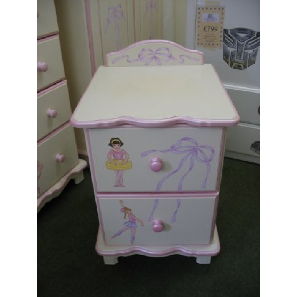 Bedside unit with 2 drawers in Ballet, Off-white/pearlised pink trim colour.Hand painted ballet dancer with ribbons and bows - a very pretty design. Units available in 14",16" or 18" wide. Choose your own artwork,base and trim colours.