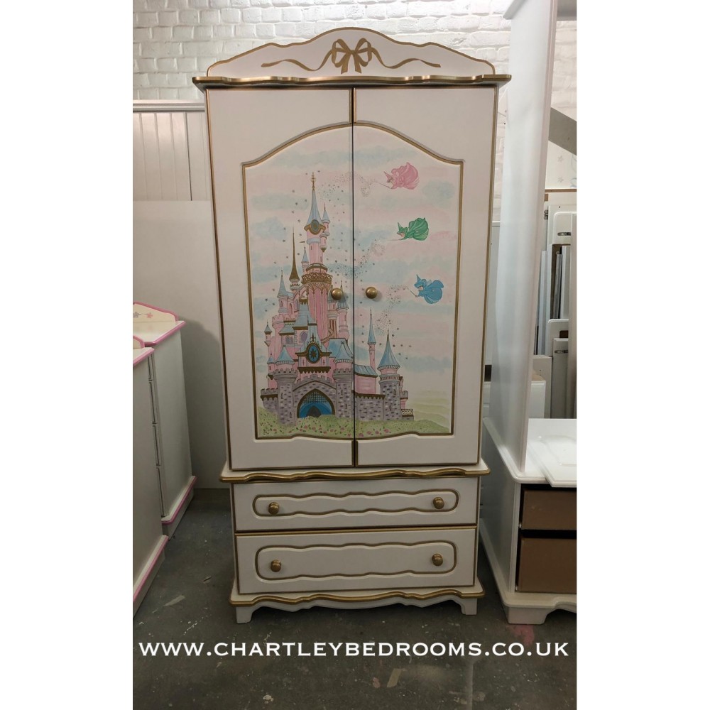 Princess castle girls wardrobe with amazing hand painted artwork. Wardrobe has 2 doors and 2 drawers. Wardrobe shown is off-white with an old gold edging colour. Size is 36" wide x 22" deep x 76" tall including the top plinth. Choose your own colours.
