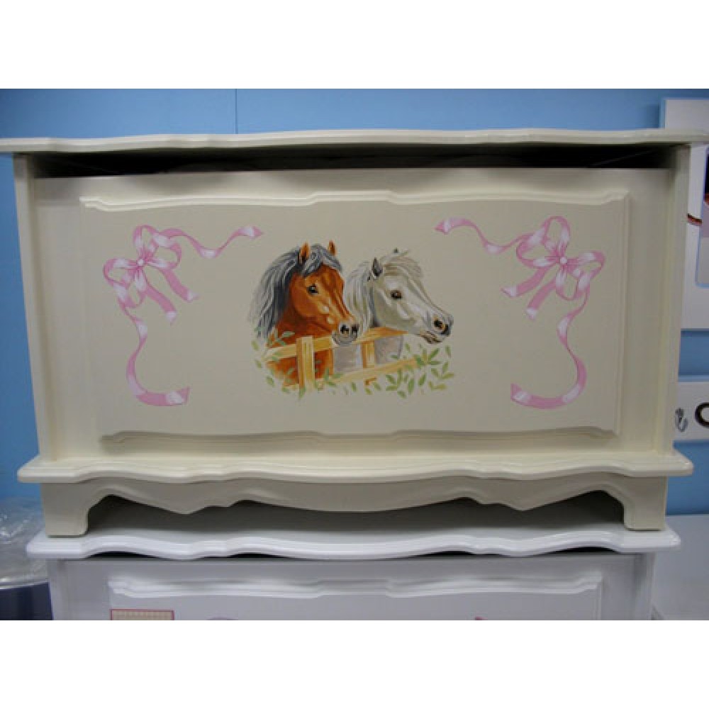 3ft Toy box in off-white with 'pretty ponies' hand-painting by Andrew. Pink ribbons can be replaced with horseshoes, if preferred! Toy box available in 2', 2ft6" and 3ft widths. Standard base colours are white, off-white (shown), pink, lilac, blue. A trim colour can also be added if required.
