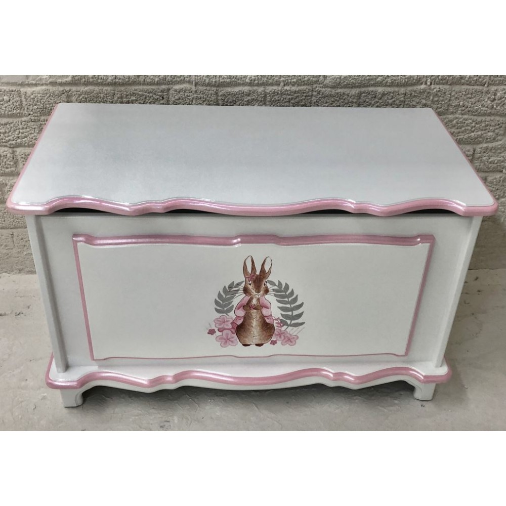 Flopsy Bunny hand painted toybox. White/baby pink edging colour. 35" x 18" x 21" tall.