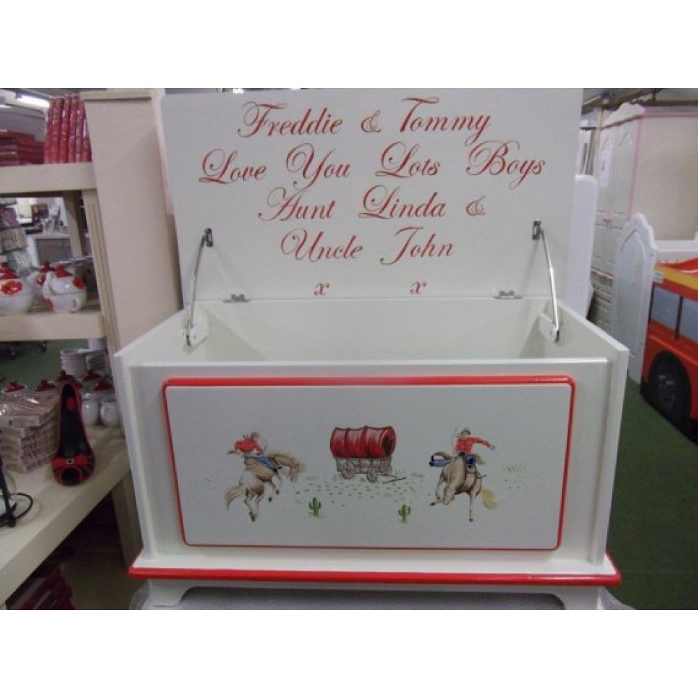 Toy box with hand painted artwork and OPTIONAL added personalised inscription inside the lid. Choose your own style of writing and colour! All messages are hand painted - not stencilled - so your toybox may take a little longer to make!