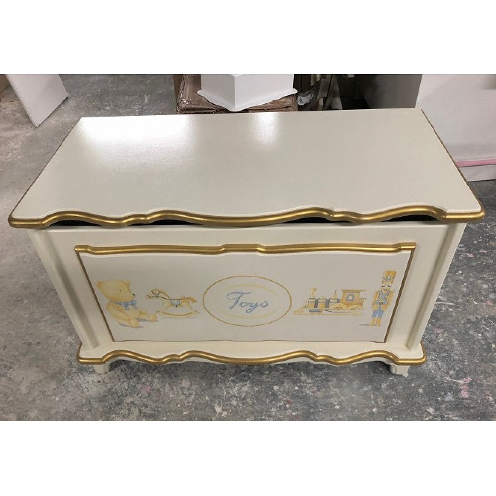 Childs 3ft size off-white and shimmering gold toybox. So beautiful...perfect for Nanny & Grandad's house too....toy storage that will last and last. Also available in a 2ft 6" size. Slow close safety hinges and full finger cut out too. Gold could be silver and TOYS could be a single name!